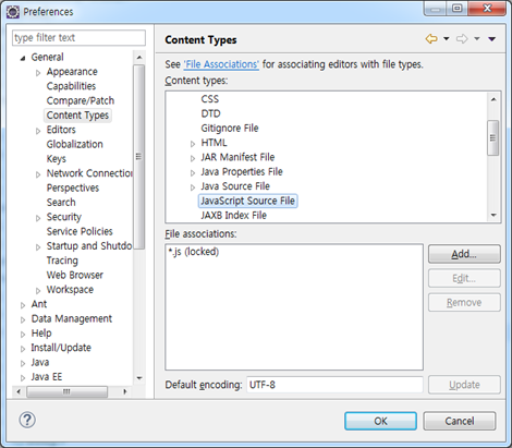 [Preferences] 대화상자가 나타나면 [General]-[Content Types]을 선택합니다. 오른쪽 [Content types]의 목록 상자에 여러 언어를 작성할 수 있는 파일 목록이 나타나면 “JavaScript Source File”을 선택합니다. 아래쪽 [Default encoding] 란에 기본으로 설정되어 있는 “UTF-8”을 “EUC-KR"로 변경하고 [Update] 버튼을 누릅니다.