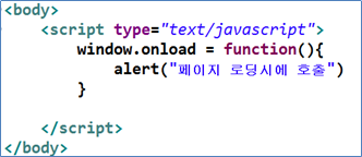 다음과 같은 코드를 작성한다. “window.onload”는 페이지가 로딩되는 시점을 나타내는 이벤트 핸들러다. 익명의 함수가 연결되어 있으므로 페이지가 로딩될 때 내부 코드가 실행될 것이다.