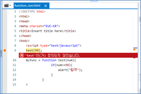 실행하면 다음과 같이 “’test’이(가) 정의되지 않았습니다.”라는 메시지가 출력된다. 함수의 호이스팅이 일어나지 않아 함수명을 인식하지 못하는 것을 확인할 수 있다.