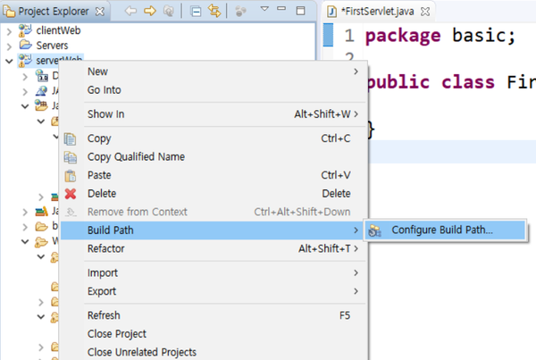 Servlet과 JSP 라이브러리를 프로젝트에 등록해야 합니다. 프로젝트 폴더를 선택하고 단축메뉴를 나타낸 후 [Build Path]-[Configure Build Path]를 선택합니다.