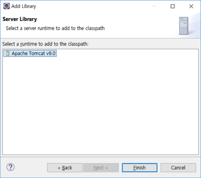 현재 실행 중인 서버가 Servlet과 JSP 라이브러리를 포함하고 있으므로 실행 중인 서버인 "Apache Tomcat v9.0"을 선택합니다.