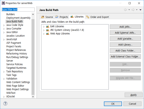 서블릿을 작성하기 전에 해야 할 일이 있습니다. 이클립스에서 작성하는 프로젝트는 기본 플랫폼인 J2SE만 인식하고 있기 때문에 Servlet과 JSP를 사용할 수 있도록 라이브러리를 등록해야 합니다.