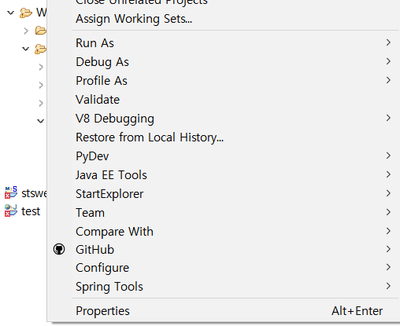 위와 같은 오류가 발생하는 경우 서버로 웹 관련 Application이 실행되지 않기 때문에 아무것도 할 수가 없습니다. 프로젝트에 서버가 제대로 등록되지 않아서 발생하는 오류입니다. 프로젝트를 선택하고 단축메뉴에서 [Properties]를 선택합니다.