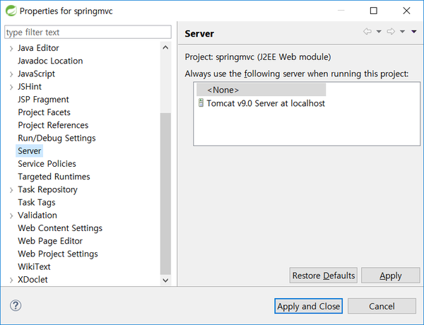 [Properties] 대화상자가 나타나면 [Server] 메뉴를 선택합니다. 아래와 같이 "Always use the following server when running this project"의 목록에서 보면 "Tomcat v9.0 Server at localhost"가 선택되어 있지 않고 "<None>"이 선택되어 있는 것을 볼 수 있습니다. "Tomcat v9.0 Server at localhost"을 선택하면 정상 실행됩니다.