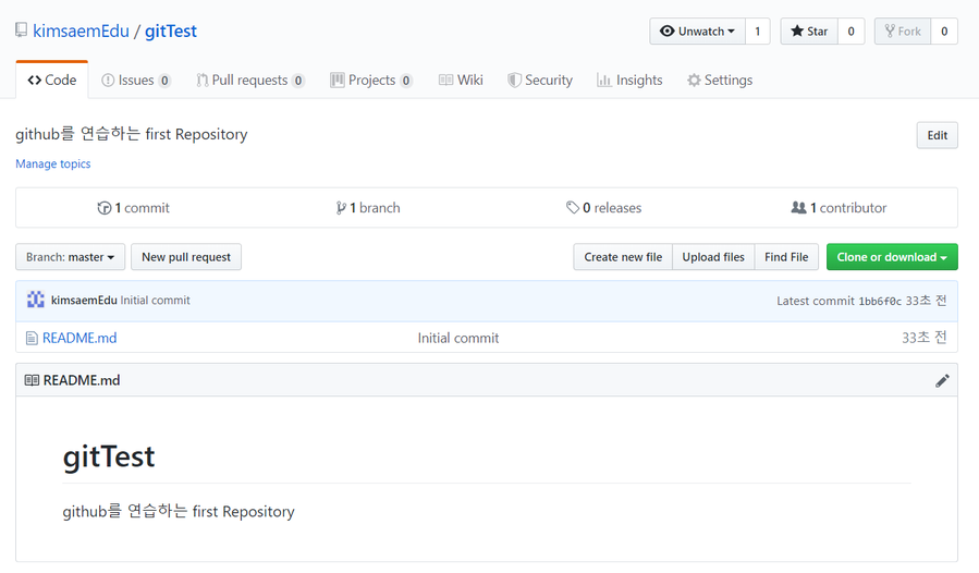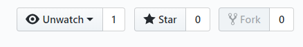 첫 번째 "Unwatch"버튼은 이 github내에서의 활동내역을 사용자에게 알려주는 기능으로 댓글등이나 이슈등에서 언급될때만 알려주는 "Not watching"을 선택하거나 모든 활동 내역을 알려주는 "Watching" 모든 알람을 무시하는 "Ignoring"을 선택할 수 있습니다. 오른쪽 숫자 "1"은 내 프로젝트의 활동내역을 보고 있는 사람의 숫자를 의미합니다.