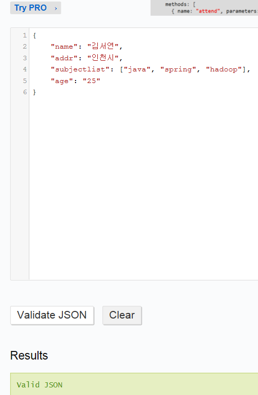 위와 같이 copy가 완료되면 [Validate JSON] 버튼을 눌러 검증 작업을 시작합니다. 유효한 JSON이면 "Valid JSON"메시지가 나타나며