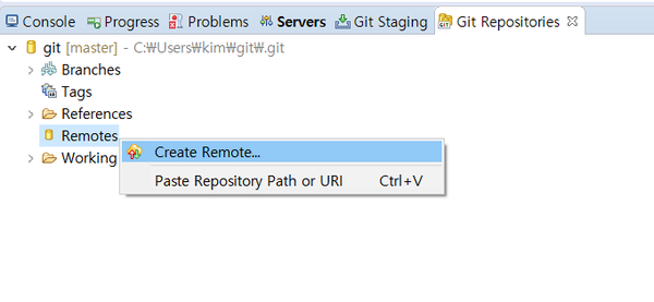 로컬 저장소가 보이며 이 저장소의 확장 버튼을 눌러 다음과 같이 구조가 보이도록 설정합니다. 서브메뉴 항목 중 [Remote]를 선택하고 마우스 오른쪽 버튼을 눌러 [Create Remote..]를 선택합니다.
