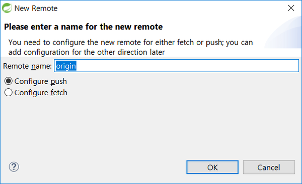[New Remote] 대화상자가 나타나면 remote name은 기본 “origin”으로 주고 [ok] 버튼을 누릅니다.