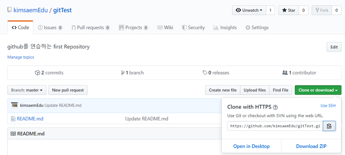 다음과 같은 대화상자가 나타나면 [change] 버튼을 누릅니다. Github와 연결할 것이므로 연결할 github의 repository로 이동한 후 [Clone or download] 버튼을 누르고 copy 합니다.