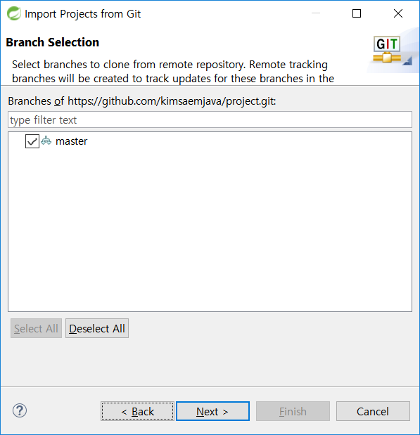 브랜치를 선택합니다. 지금은 master 브랜치만 있으니 master 브랜치를 선택합니다.
