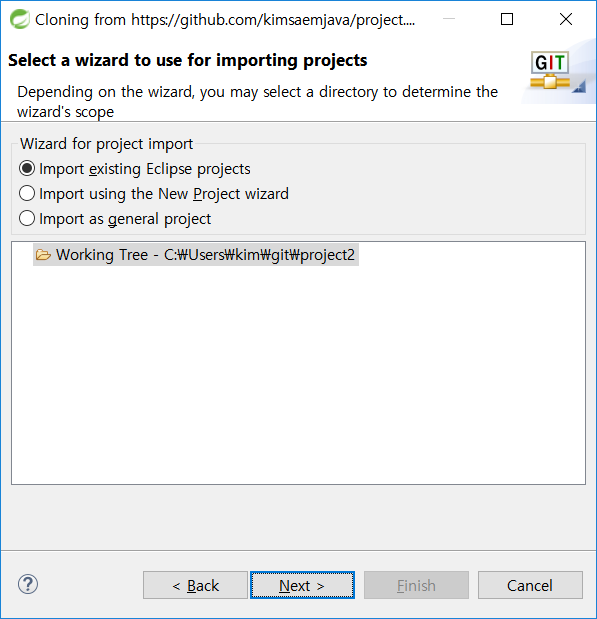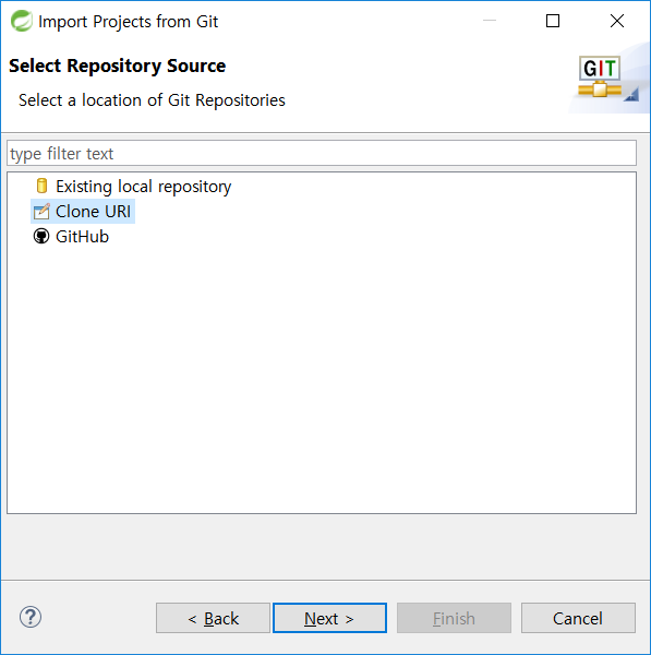 [Clone URI]를 선택하고 [Next] 버튼을 누릅니다.
