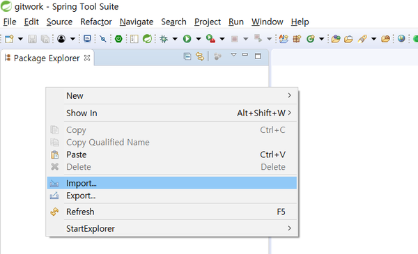 STS의 [Package Explorer]에서 단축메뉴를 누르고 [import]를 선택합니다.