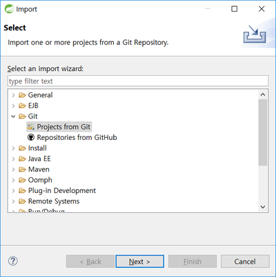 [Select a wizard to use for importing projects] 대화상자에서 [Import existing Eclipse projects]를 선택합니다.