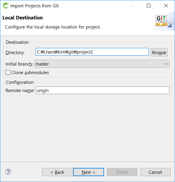 로컬 저장소를 선택하는 단계입니다. 기본을 사용하셔도 좋고 수정하셔도 됩니다.