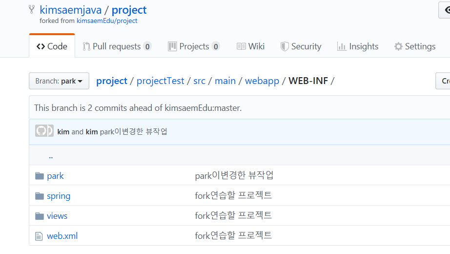 master 브랜치에서 확인해 보면 추가한 "park"폴더가 보이지 않습니다. 우리가 작업하기를 새롭게 추가한 "park"브랜치에서 작업했기 때문입니다.