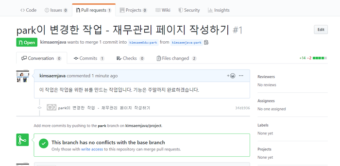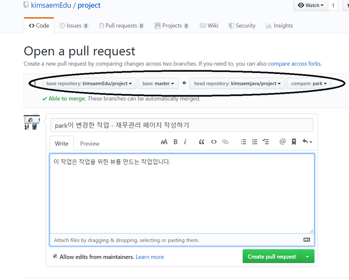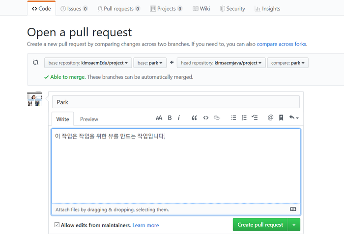 화면을 보면 park 브랜치에서 원본 저장소의 원격지 park 브랜치로 요청을 하고 있는 것을 볼 수 있습니다. 기본 설정은 원본 저장소의 master 브랜치에 병합되는 것입니다. 만약 한 단계 더 작업하겠다면 원본 저장소에 브랜치를 만들고 작업해야 합니다.