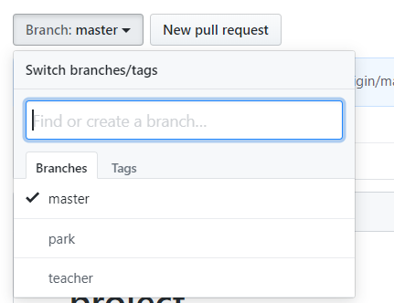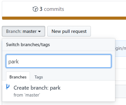 작업 repository로 이동한 후 [Branch:master]의 ▼버튼을 누릅니다. 작성하고 싶은 브랜치명을 입력하고 [Create branch: park] 메뉴를 선택합니다.