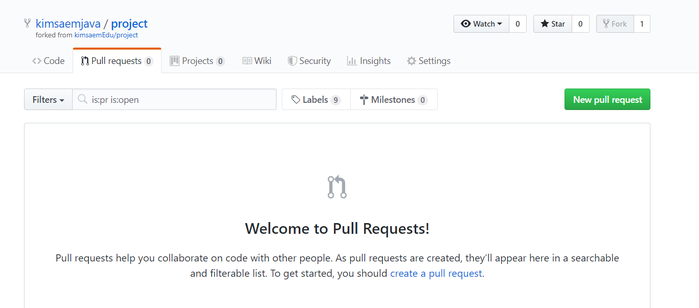 즉, 팀장이 프로젝트를 위해 만들어 놓은 저장소를 여러분들께서 fork 하셨습니다. 여러분들께서는 변경의 권한이 없으므로 원본에 반영하고 싶다면 원본 저장소의 계정으로 요청을 해야 합니다. 이 작업을 Pull request라 합니다. 결재를 상사에게 올리는 것과 동일한 원리라 생각하면 됩니다.