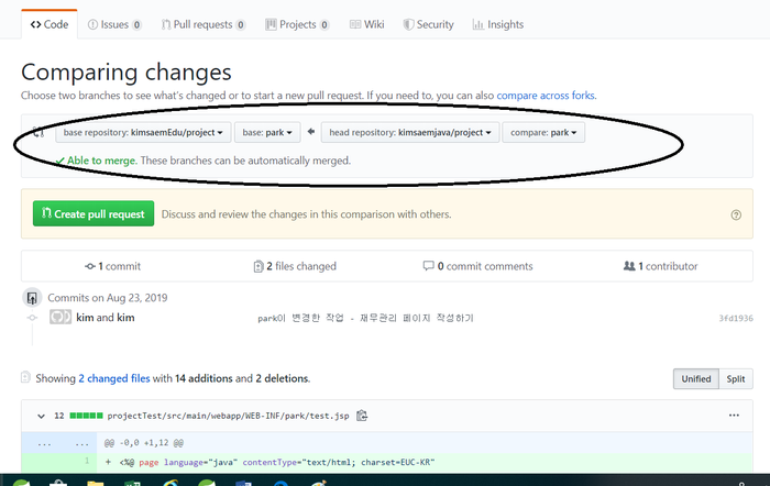 브랜치 선택하는 메뉴에서 base repository에서도 park브랜치를 선택하고 head repository에서도 park브랜치를 선택합니다. commit하고 아직 pull request하지 않은 소스코드 화면으로 전환됩니다. 이 화면에서 [Create pull request] 버튼을 누릅니다.