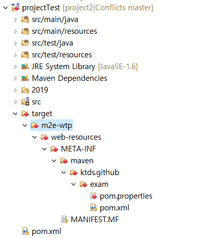 프로젝트를 보면 빨간색으로 오류처럼 충돌한 파일이 변경된 것을 알 수 있습니다. 설정 파일은 대부분 merge 할 때 충돌이 발생합니다. 설정이 모두 다르니 그럴 수밖에 없겠죠? 설정 파일은 가급적 포함시키지 말고 나머지 동시에 수정한 파일은 수동 편집하도록 합니다. 편집이 끝나면 stage 영역으로 보내고 로컬 저장소에 commit까지 완료해야겠죠?