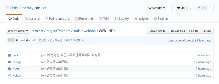 github 사이트에서 확인하면 park 브랜치에서만 보이던 변경 내용이 master 브랜치에서 merge되어 보이는 것을 확인할 수 있습니다.