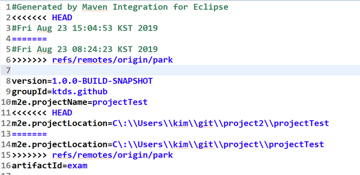 충돌이 일어난 부분은 알아보기 쉬우라고 <<<<<<<HEAD와 =========, >>>>>>로 코드를 구분하여 표시해 놓습니다.