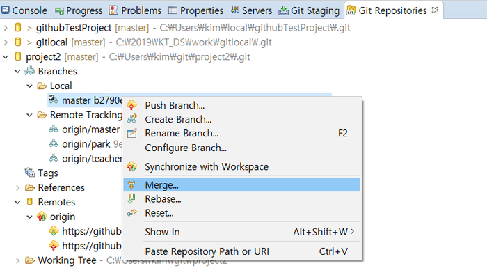 fetch 한 모든 브랜치의 변경된 파일을 master에 병합해야 합니다. 그래야 push 할 수 있겠죠? [Git Repositories] 뷰의 [Branches]-[Local]의 master를 선택하고 [Merge]를 선택합니다.