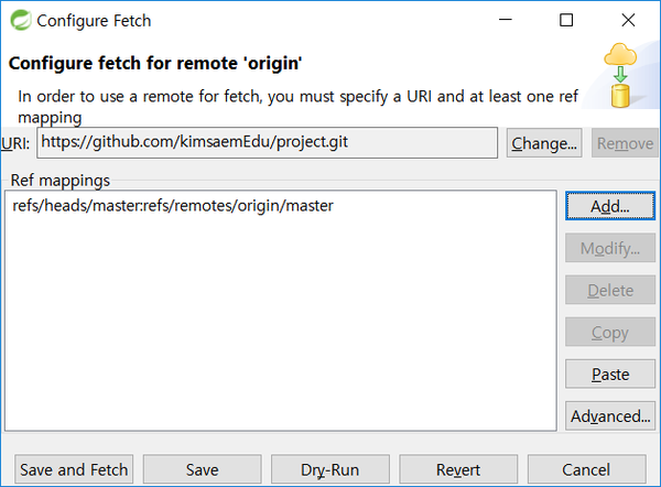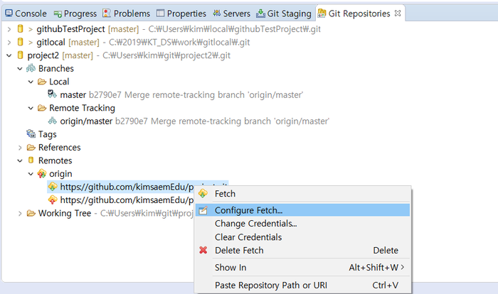 현재 작업 중인 로컬 저장소의 [Remotes]-[origin]의 fetch 아이콘을 선택하고 [Configure fetch..]를 선택합니다.