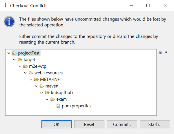 merge가 성공되어야 하는데 혹시 아래와 같은 대화상자가 나타나는 경우가 있습니다. commit 하지 않은 파일이 발견되기 때문에 merge가 되지 않는다는 메시지입니다.