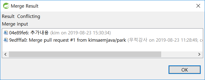 다시 merge 기능을 선택하면 merge가 잘됩니다. 그러나 자세히 보면 [Merge Result] 대화상자의 결과 메시지가 "Result Conflicting"인 걸 볼 수 있습니다.