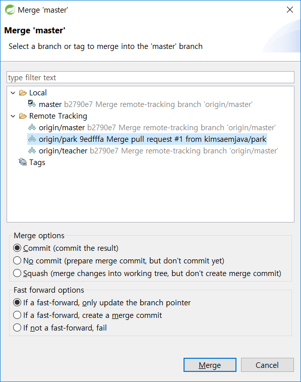 [Merge] 대화 상자가 나타나면 [Local]의 master와 fetch 받은 목록의 모든 브랜치를 하나하나 모두 병합해야 합니다. 우선 [Remote Tracking]의 park 브랜치를 선택하고 [merge] 버튼을 선택합니다.