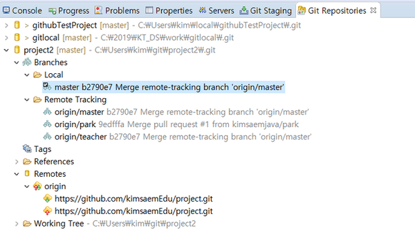 github 사이트에서 merge 한 각 브랜치의 변경된 파일을 STS에서 fetch 한 후 master 브랜치에서 병합해야 합니다.