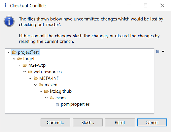 브랜치의 전환도 변경된 내용이 각 브랜치 별로 로컬 저장소에 저장되지 않으면 다음과 같이 [Checkout Conflicts] 대화 상자가 나타납니다.
