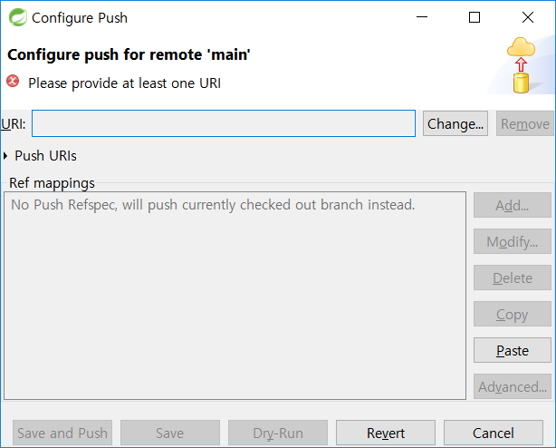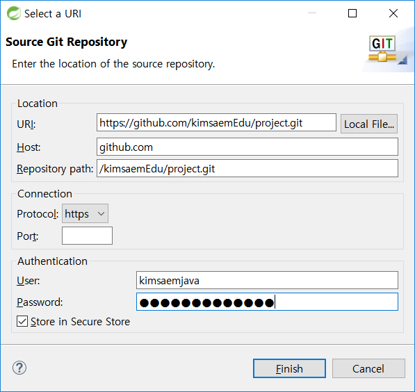 [Select a URI] 대화상자에서 Location은 원본 저장소의 주소를 복사합니다.