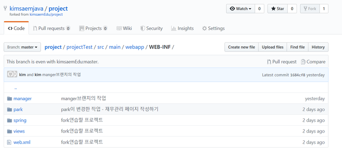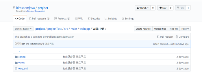 또 한 가지 반드시 지켜주셔야 할 것은 이렇게 원본 저장소의 master를 동기화하는 경우 반드시 master 브랜치 상태에서 작업을 해야 한다는 것입니다.