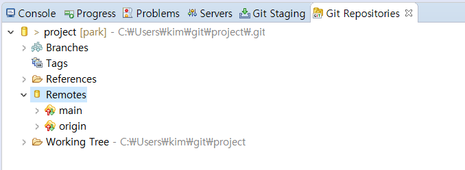 [Save and Fetch] 버튼을 선택합니다. fetch가 완료되면 [Git Repositories] 뷰의 [Remote Tracking]에 원본 저장소의 내용이 등록되어 있는 것을 확인할 수 있습니다. fetch가 정상 완료됐습니다.