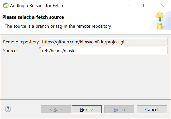 [Configure Fetch] 대화상자에서 [Add] 버튼을 누르고 다운로드할 브랜치를 선택합니다. 지금은 원격 저장소의 master 브랜치를 받아서 동기화를 할 것이므로 master 브랜치만 등록합니다.