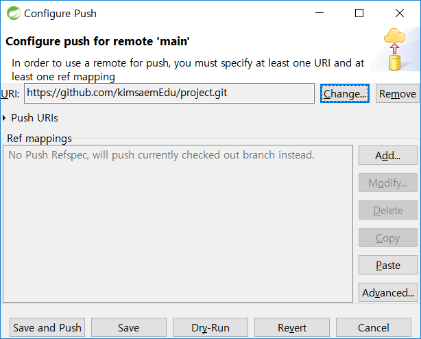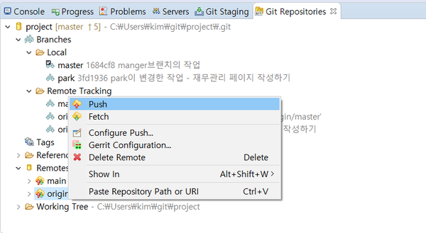 [Remote]의 "origin"이 나의 원격 저장소이므로 선택하고 [Push]를 메뉴에서 선택합니다.