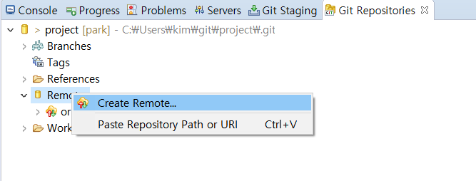 [Git Repositories] 뷰에서 [Remote]를 선택하고 [Create Remote]를 선택합니다.