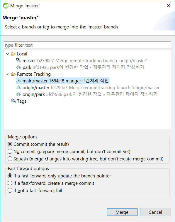 [Merge] 대화 상자가 나타나면 [Remote Rracking]에 fetch된 원격 저장소의 master 브랜치를 선택하여 [Merge] 버튼을 누릅니다.