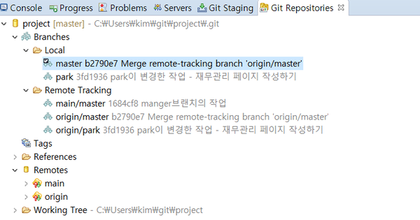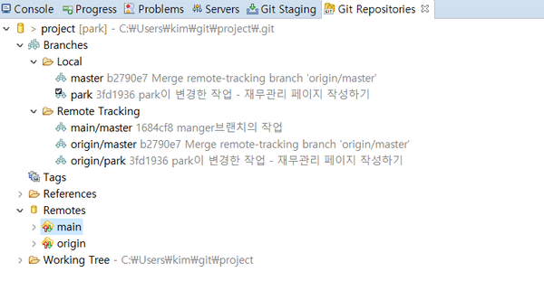 지금은 park 브랜치입니다. 반드시 master 브랜치를 더블 클릭하여 선택합니다.