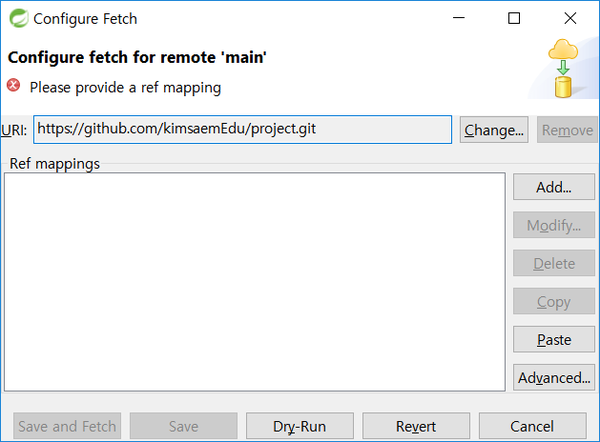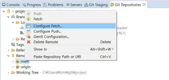 메인 저장소를 선택하고 단축메뉴에서 [Configure Fetch]를 선택합니다.