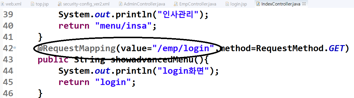 이 경로는 spring security 적용하기 전에 우리가 요청하던 로그인 페이지를 실행하는 path를 정의하면 됩니다. 원래 우리 kimsaemERP의 로그인 페이지를 보기 위해 요청하던 path는 /emp/login.do 였으나. do를 없애고 /emp/login으로 변경해 보았습니다.