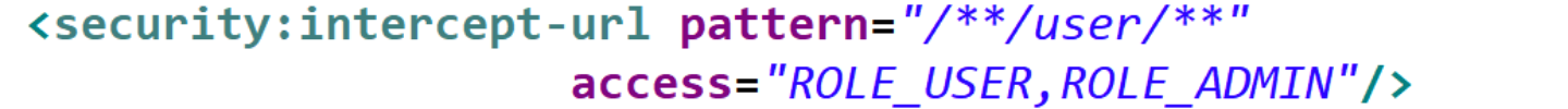 <security:intercept-url pattern="/**" access="ROLE_USER,ROLE_ADMIN"/>