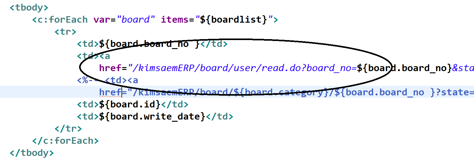 먼저 /WEB-INF/board/boardlist.jsp를 열고 제목 클릭하여 상세보기를 보는 부분과 글쓰기 뷰를 보는 부분을 수정해야 합니다.