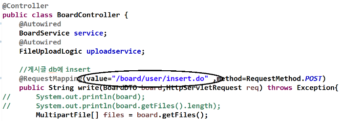 BoardController를 열고 글 등록의 value를 아래와 같이 /board/user/insert.do로 변경합니다.