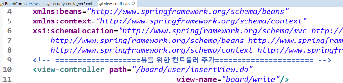 글 등록 뷰를 실행하는 요청도 변경해야 합니다. 뷰만 청하는 것은 설정 파일에 등록하였으므로 /WEB-INF/config/view-config.xml을 실행합니다.