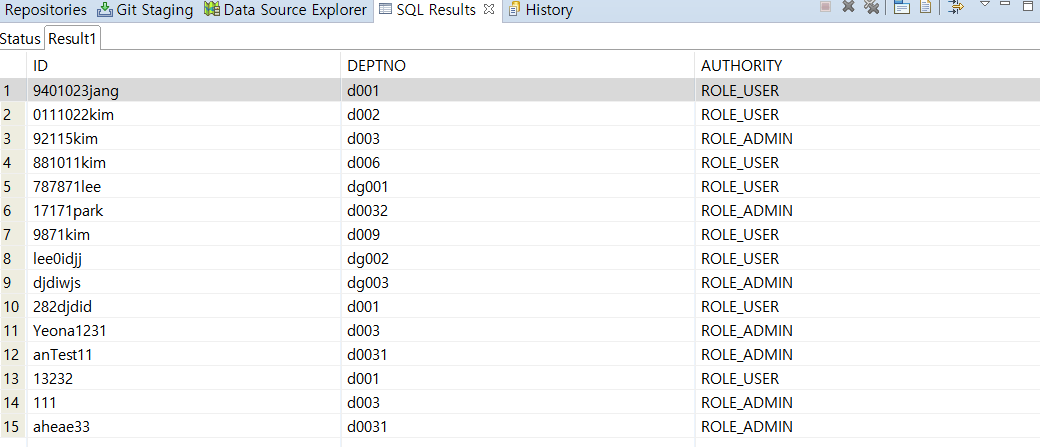 member테이블에 저장된 데이터 중 "92115kim"사용자는 "d003"부서이고 "d003"부서는 "j003"그룹이므로 "ROLE_ADMIN"에 해당하는 사용자입니다.