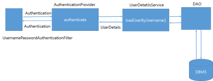 AuthenticationProvider는 여러 가지가 존재하고 여러 개를 이용하여 인증할 수 있습니다.. AuthenticationProvider의 메서드 내부에서 UserDetailsService의 메서드를 호출하여 db와의 인증처리를 실행합니다. 실행이 완료되면 AuthenticationProvider안에서 db에서 조회한 데이터와 사용자가 입력한 패스워드를 비교하며 인증처리를 합니다.