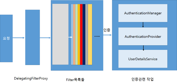 인증처리를 spring security 내부 필터들이 동작하여 처리하며 인증 정보를 Authentication에 담아 AuthenticationManager에 넘깁니다. AuthenticationManager가 spring security안에서 인증을 담당하는 객체입니다. AuthenticationManager가 인증을 관리하지만 인증을 직접적으로 하지않고 AuthenticationProvider를 통해 인증하도록 합니다.